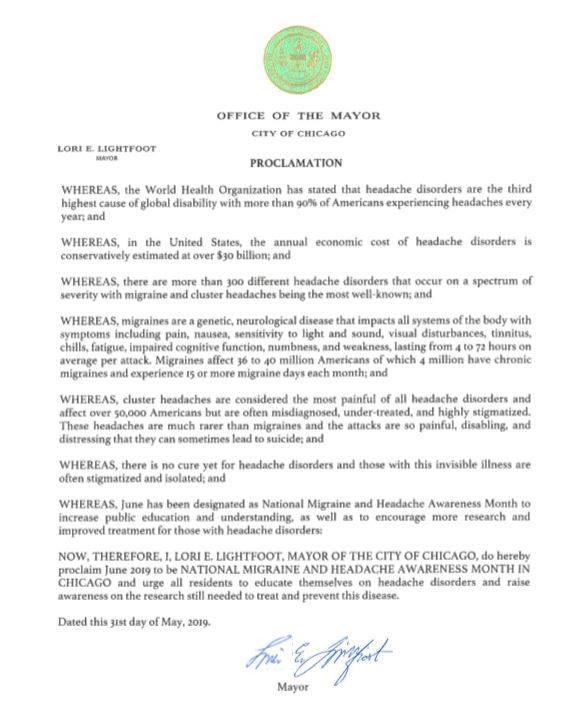 - The city of Chicago proclamation declaring June Migraine and Headache Awareness Month