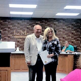 - Kimberly Waterbury and Mayor Dick Kirchoff with the proclamation in Lemars, Iowa