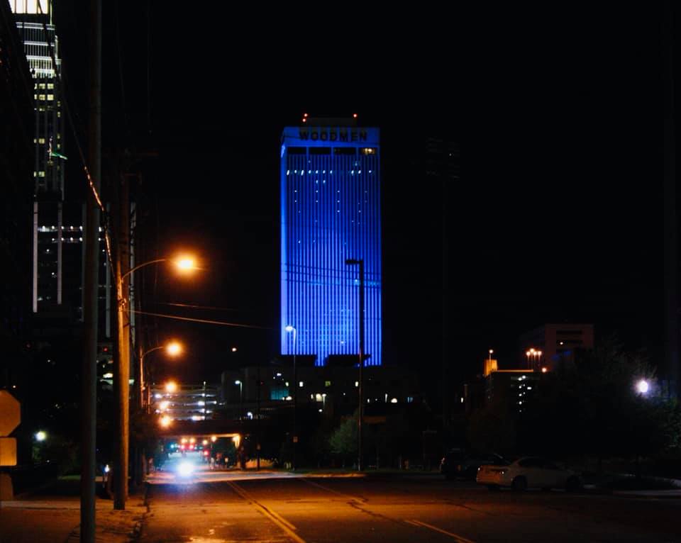 - The WoodmanLife Tower in Omaha lit up in blue. Photo Credit: Jeff Cavanaugh.