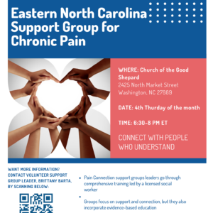 Eastern North Carolina (in-person) chronic pain support group This is an in-person support group open to anyone with chronic ... 26 Mar 6:30 pm - 8:00 pm